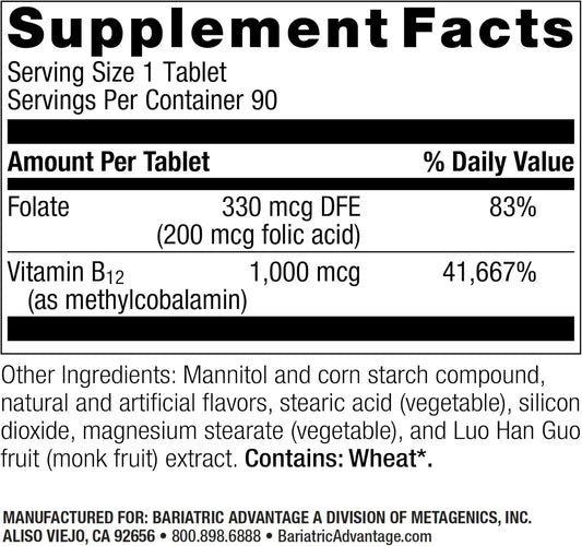 Bariatric Advantage Vitamin B12 Speedy Melts with Folic Acid - Peppermint Flavor, 90 Count - Fast Melting 1000 mcg Supplement