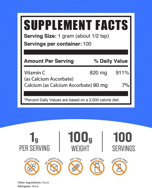 BulkSupplements.com Buffered Vitamin C Calcium Ascorbate Powder - Gluten Free Calcium Supplement Powder - 1000mg per Serving - 100 Servings - 100g
