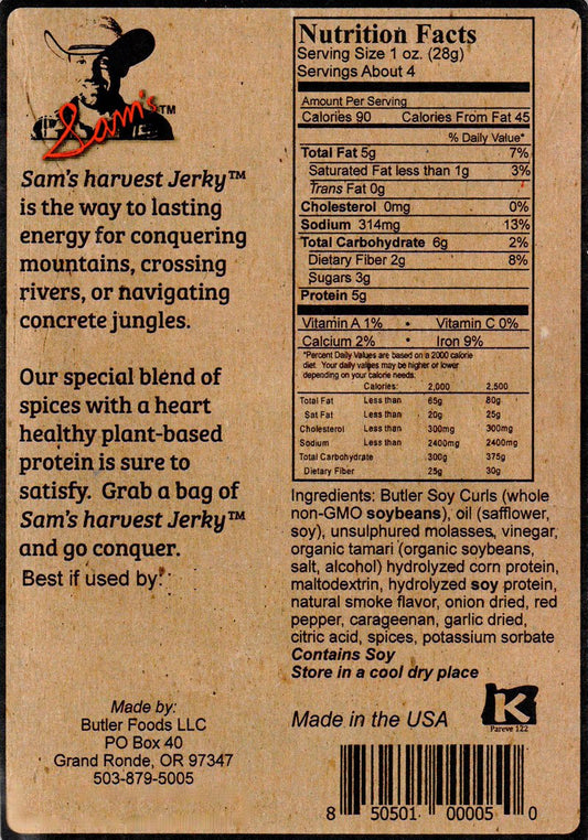 Butler Foods Sam's Harvest Jerky - Original Recipe, 4 oz. Bag, 12 Pack - Delicious Vegan Snack made from Soy Protein