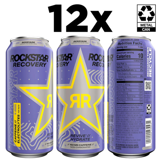 Berryade Rockstar Recovery Energy Drink - Non-Carbonated Hydration & Energy Boost - 16 fl oz Cans (12 Pack) - 160mg Caffeine, B Vitamins, Electrolytes for Mind-Body Energy