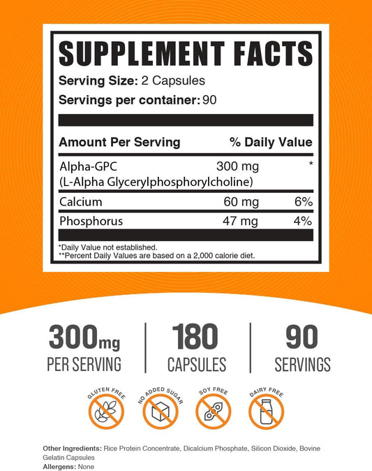 Alpha GPC Capsules 300mg - Choline Acetylcholine Gluten Free Supplement - 180 Capsules
