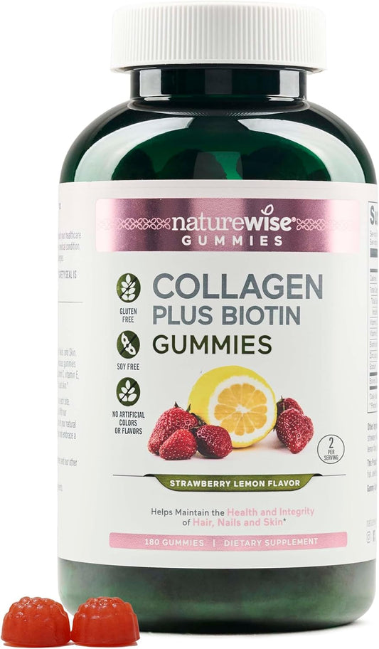 180 Count NatureWise Collagen Gummies for Women - Strawberry Lemon Flavor with Type 1 & 3 Peptides, Biotin, Vitamin C, E, and Zinc - Hair, Skin, Nails, & Joint Support - 3-Month Supply