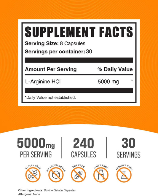 BulkSupplements L-Arginine HCl Capsules - 5000mg Nitric Oxide Supplement, Gluten-Free, 240 Capsules - High-Quality Arginine Supplement