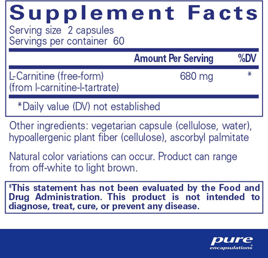 Pure Encapsulations L-Carnitine Capsules for Cardiovascular & Endurance Support - Hypoallergenic Supplement (120 ct)