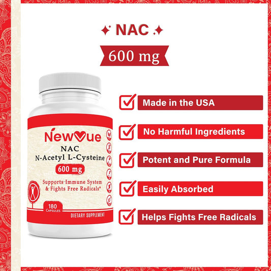 N-Acetyl L-Cysteine (NAC) 600mg, 180 Capsules - Non-GMO, Gluten Free Supplement for NewVue