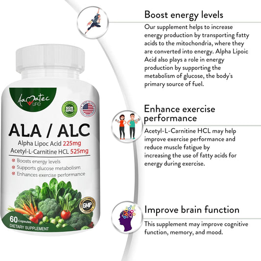 High Potency Alpha Lipoic Acid and Acetyl L-Carnitine Supplement for Antioxidant Support and Energy Boost - 60 Capsules for Men and Women by AAMATEC LIFE