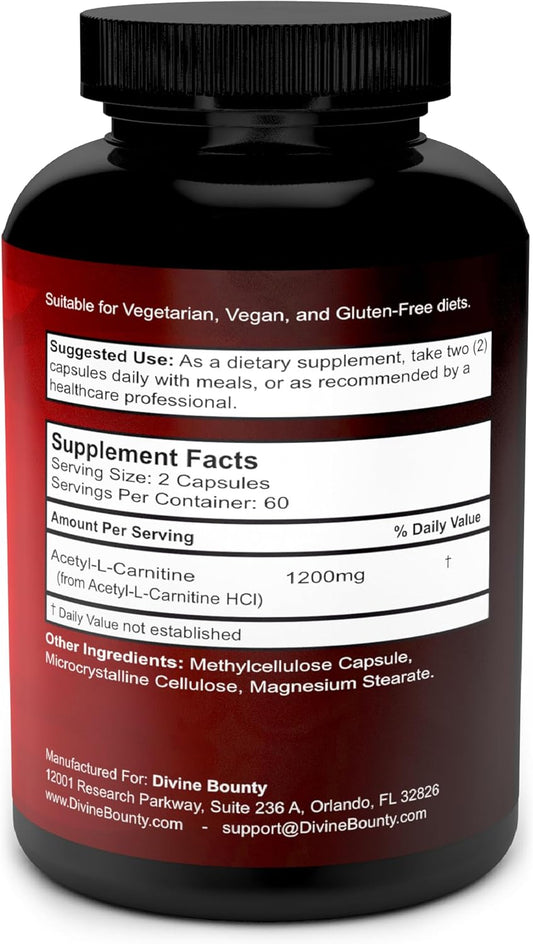 High Strength Acetyl L-Carnitine Capsules - 1200mg Per Serving - 120 Vegetarian Capsules - L Carnitine Supplement