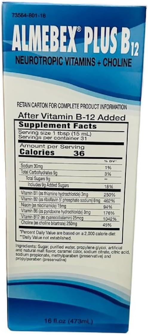 Almebex Plus B12 Liquid Supplement - Neurotropic Vitamins with Choline - 16 fl. oz