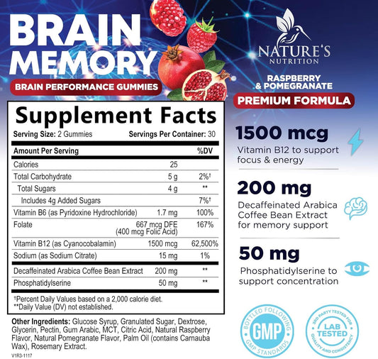 Brain Memory Gummy Supplement for Concentration & Clarity - Cognitive Vitamins for Men & Women - 60 Gummies - Boost Focus & Alertness with B6, B12, Phosphatidylserine, Coffee Extract & Nootropics