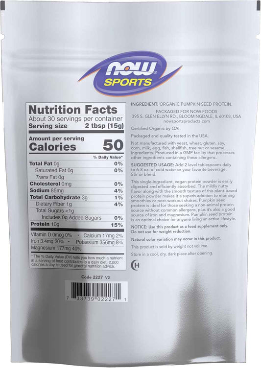NOW Foods Sports Nutrition, Organic Pumpkin Seed Protein Powder With 10g of Protein, Certified Non-GMO, Unflavored, 1-Pound