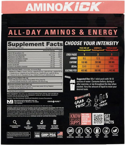 NutraBio Amino Kick Raspberry Lemonade - Performance Formula for Energy, Hydration, Recovery - 20 Servings - 6g Amino Acids - Muscle Building Support