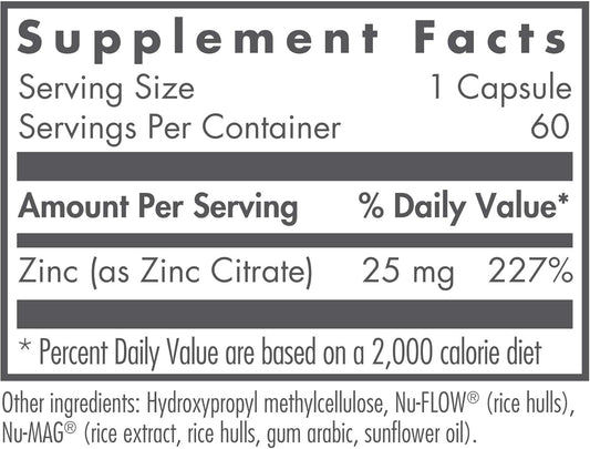 Nutricology Zinc Citrate Supplement - 25mg Immune Support Trace Mineral Capsules - 60 Count, Vegetarian Formula for Men & Women