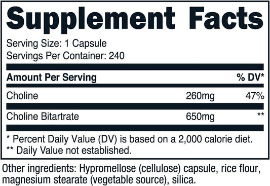 Nutricost Choline Bitartrate 650mg, 240 Vegetarian Capsules - Non-GMO, Vegetarian Friendly, Gluten Free