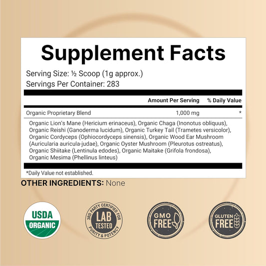 Organic 10-in-1 Mushroom Powder Blend, 10oz - Lions Mane, Shiitake, Reishi, Turkey Tail, Chaga & More - Energy Boost, Immune Support, Brain Health - No Fillers - Great for Coffee