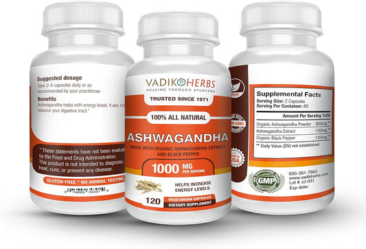 Organic Ashwagandha Root Extract Capsules - 1000mg, 120 Vegan Capsules - Mood Enhancer, Immune & Thyroid Support - 2 Month Supply
