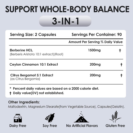 Organic Berberine Supplement 1500mg with Ceylon Cinnamon & Citrus Bergamot | Non-GMO Formula for Metabolic & Weight Support | 3-Month Supply, 180 Capsules