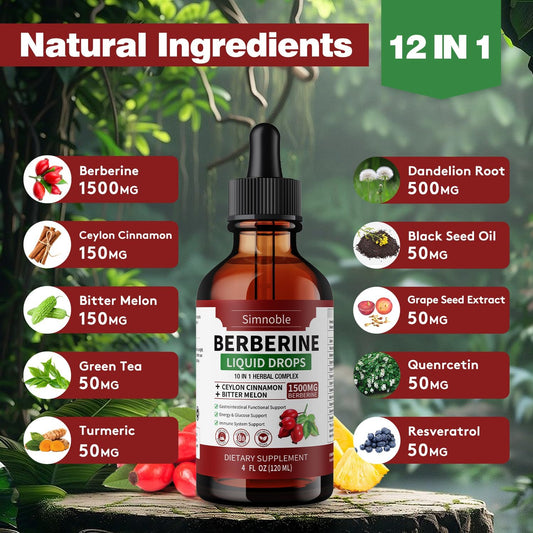 Organic Berberine Liquid Drops with Turmeric, Bitter Melon, Ceylon Cinnamon - 1500mg Supplement for Women and Men - 4 Fl Oz - High Absorption Formula with 10 Natural Ingredients