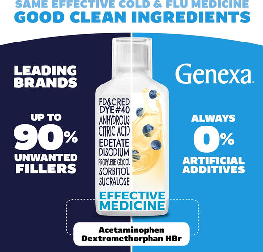 Organic Blueberry Flavored Daytime Cold & Flu Relief for Body Pain, Cough, Headache - Genexa Clean Severe Cold & Flu Formula, Dye-Free with 0% Artificial Additives - 6 fl oz