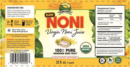 Organic Hawaiian Noni Juice - 4 Pack of 32oz Glass Bottles - RAW & Unpasteurized - Kanai Farms Virgin Noni Juice