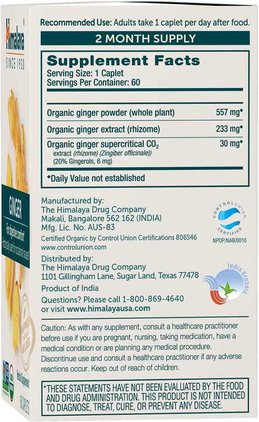Organic Himalaya Ginger Supplement for Nausea, Gas, Upset Stomach - 60 Caplets, 2 Month Supply - Equivalent to 4,766 mg Ginger Powder - Natural Relief