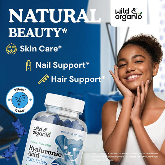 Organic Hyaluronic Acid Gummies 250mg - Vegan Hair, Skin, and Nails Supplement with Vitamin C - Pure HA Powder - 60 Chewables