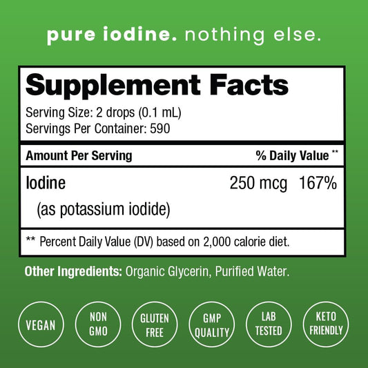 Organic Iodine Liquid Drops - 250 mcg Supplement for Thyroid Support - Potassium Iodide Solution - Non-GMO, Vegan - 590 Servings