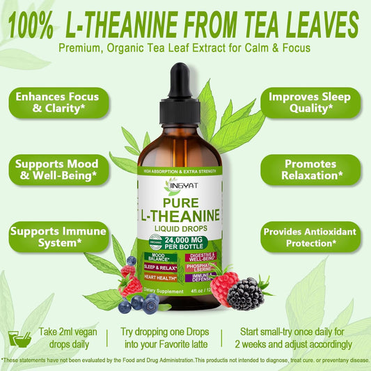 Organic L-Theanine Liquid Drops 400mg for Focus & Sleep Support - Non-GMO & Gluten Free - 60 Servings