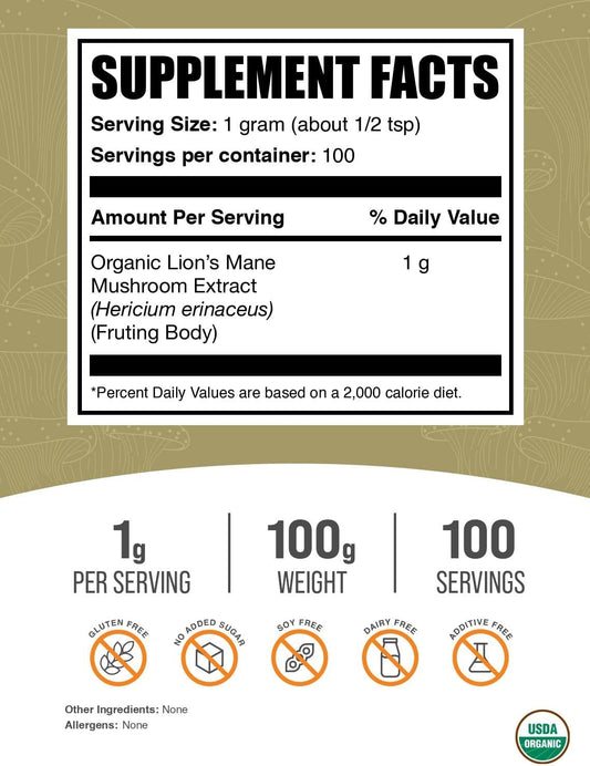 Organic Lion's Mane Mushroom Extract Powder - 1000mg per Serving, 100g (3.5 oz) - Lions Mane Supplement Powder - Mushroom Supplement