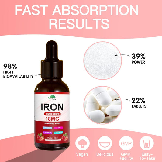 Organic Liquid Iron Supplement for Immune Support - VPKIN Iron Complex with Folate, Vitamin C, B12 for Fast Absorption - Vegan Formula for Women & Men - Strawberry Flavor, 2 Fl Oz