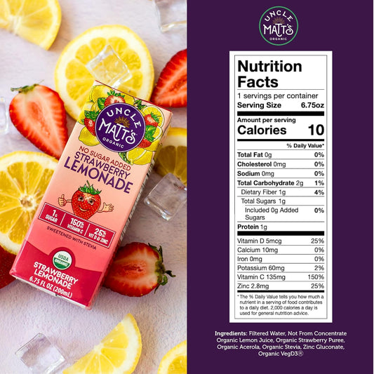 Organic No Sugar Added Strawberry Lemonade Juice Box for Kids - Vitamin C, D, Zinc, 10 Calories - 32 Pack of 6.75 oz Boxes