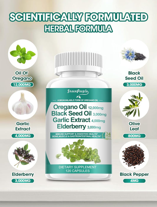 Organic Oregano Oil Capsules with Black Seed Oil, Garlic Extract, Vitamin D3 & Magnesium - 120 Pills for Immune & Digestive Support - Vegan & Non-GMO Formula