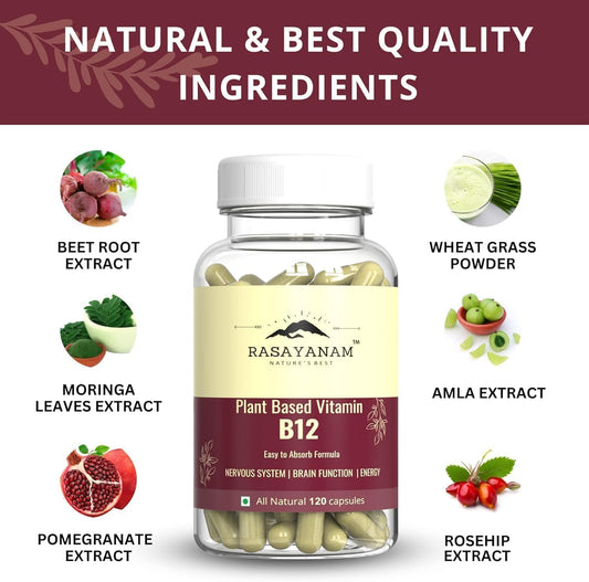 Organic Plant Based Vitamin B12 Supplement (120 Capsules) for Men & Women | Supports Nervous System & Brain Function in Vegetarians & Vegans