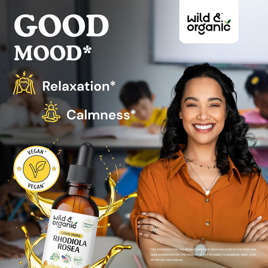 Organic Rhodiola Rosea Tincture for Mood Support - Relaxing Supplement with Root Extract - Vegan Liquid Drops - Sugar & Alcohol-Free - 2 fl oz