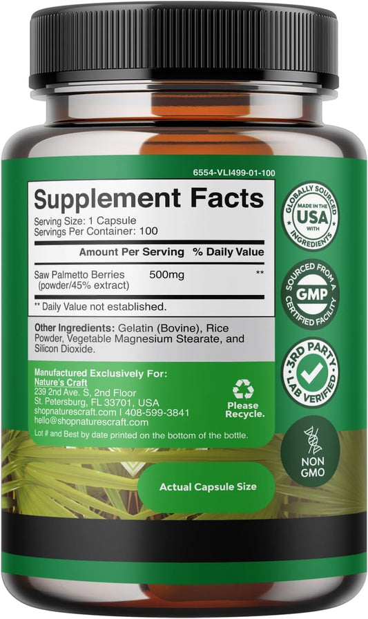 Organic Saw Palmetto Extract for Hair & Urinary Health - Herbal Supplement with Plant Sterols & Flavonoids - 500mg per Serving - 100 Capsules