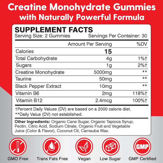 Organic Vegan Creatine Gummies with Taurine & Vitamins - 5000mg Pre-Workout for Maximum Strength, Muscle, Energy & Focus - Men & Women - 60 Count