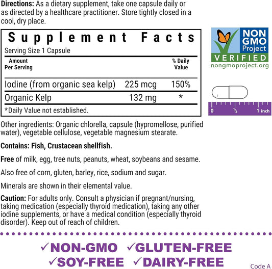 Organically Grown Bluebonnet Nutrition Atlantic Sea Kelp Iodine Capsules - Non-GMO, Gluten-Free, Dairy-Free - 225 mcg - 120 Veg Caps
