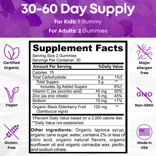 OrganicBolt Elderberry Gummies with Vitamin C & Zinc - High Potency Immune Support for Adults & Kids - USDA Organic, Vegan & Gluten Free - 60 Count