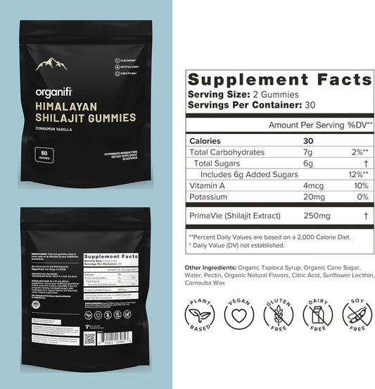 Organifi Shilajit Gummies - PrimaVie Shilajit, 40+ Trace Minerals - Hormone Balance, Energy Boost, Fatigue Relief - 60 Count