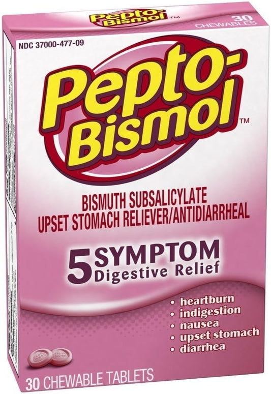 Pepto-Bismol Chewable Tablets for Digestive Relief - Cherry Flavor (Pack of 12) - 30 ea per Pack - Relieves 5 Symptoms