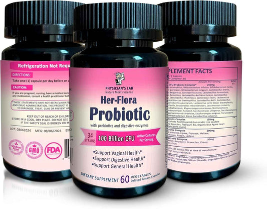 Physician’s Lab Her-Flora Women’s Probiotic 100 Billion CFU per Capsule, Non-GMO, 34 Strains, with Prebiotics & Digestive enzymes, Gut & Vaginal Health, H.Pylori Support, 60 Veg Caps,2-Months Supply!