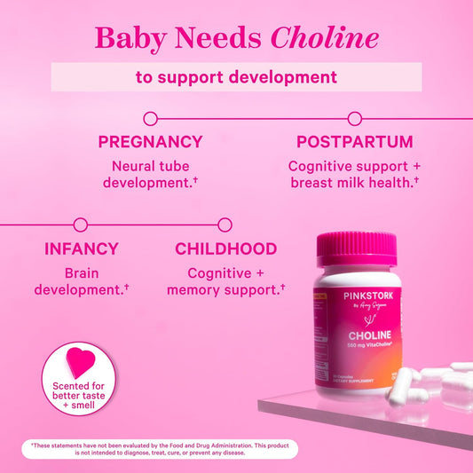 Pink Stork Choline - Prenatal Vitamin with 550mg Choline Bitartrate for Pregnant & Postpartum Moms - Supports Fetal Cognitive Health & Breast Milk Quality - 30 Capsules