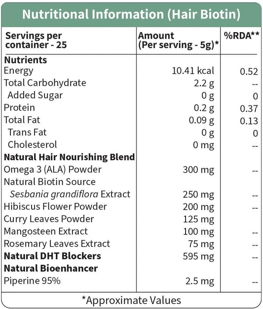 Plant Based Hair Biotin Supplement with DHT-Blocker & Omega-3 for Hair Growth - 10000mcg - Sesbania, Hibiscus, Rosemary Extract, Black Pepper - Hair Fall Control - 125g