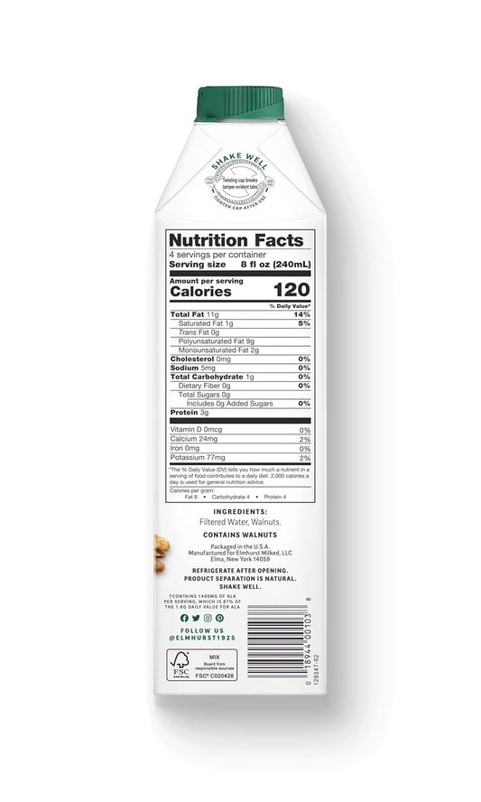 Organic Unsweetened Walnut Milk, Dairy-Free & Vegan - 32oz x 6 Pack - Elmhurst 1925 Milked Walnuts