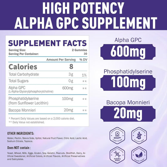 Alpha GPC & Phosphatidylserine Gummies - Brain Supplement for Memory & Focus - 600mg Chewable with Bacopa - Sugar Free - 120 Count