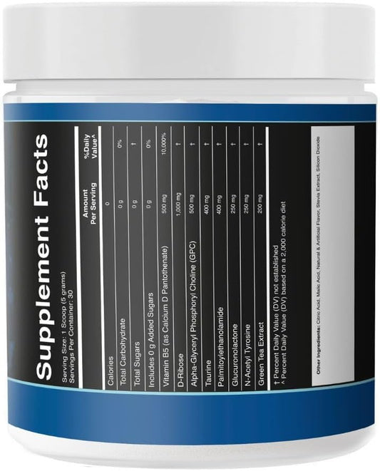 All-Natural Nootropic Pre-Workout Powder, Blue Raspberry Flavor - Caffeine-Free Nitric Oxide Booster Supplement with Beta Alanine & Alpha GPC - No Artificial Ingredients