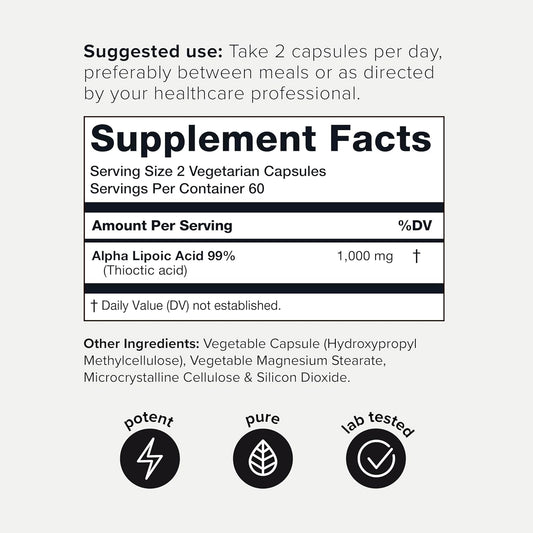 Toniiq 1000mg Alpha Lipoic Acid Capsules - 99%+ USP Standard - 120 Capsules - High Strength ALA Supplement