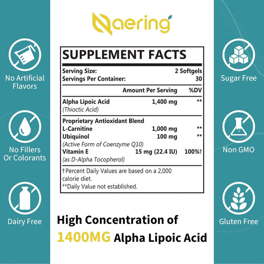 High Potency Liposomal Alpha Lipoic Acid Softgels with L-Carnitine, Ubiquinol, and Vitamin E for Antioxidant Support and Energy Boost - 60 Count