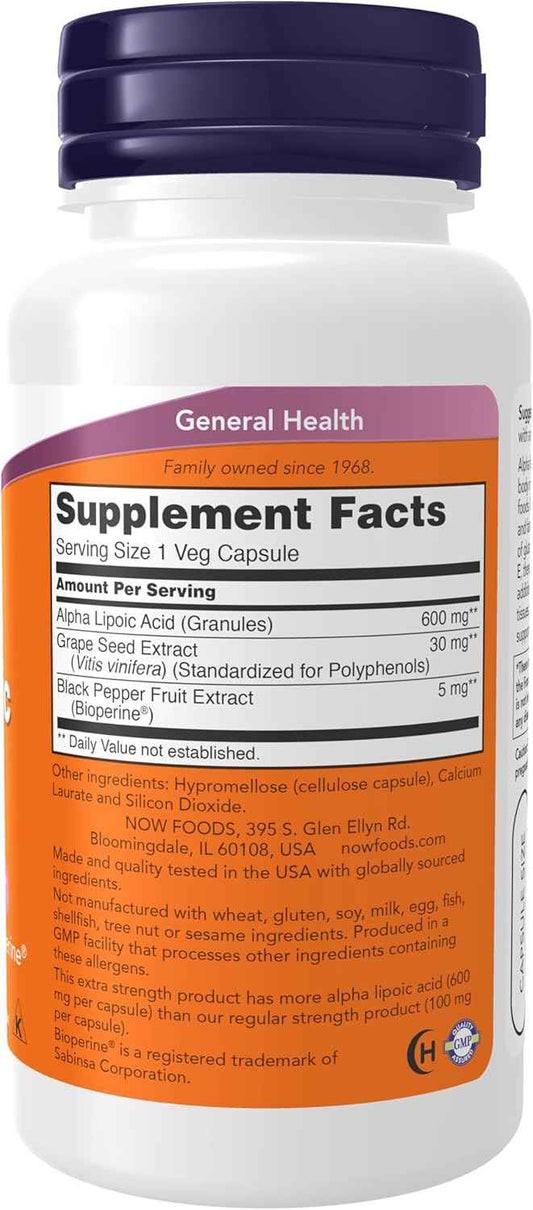 NOW Foods Alpha Lipoic Acid 600mg with Grape Seed Extract & Bioperine® - Extra Strength Supplement, 60 Count Pack