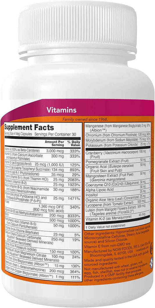 NOW Foods Eve Women's Multivitamin with Cranberry, Alpha Lipoic Acid, CoQ10, Superfruits - Pomegranate, Acai & Mangosteen - 120 Veg Capsules, Iron-Free