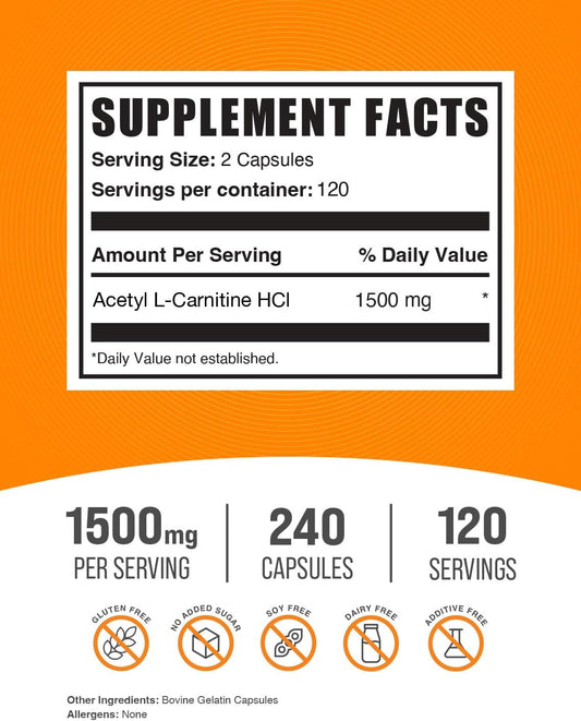 BulkSupplements.com Acetyl L-Carnitine Capsules - 1500mg ALCAR HCl Supplement for Energy - 240 Gluten-Free Capsules, 2 Capsules/Serving
